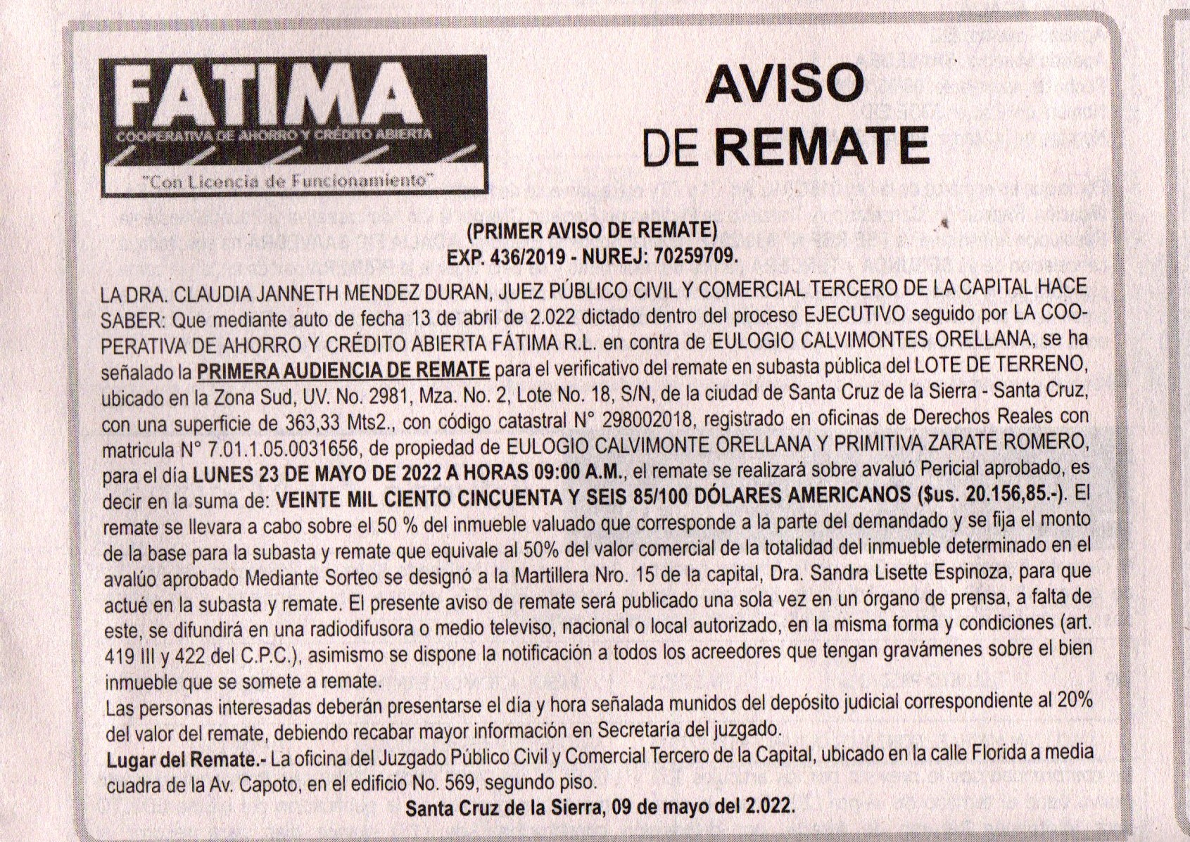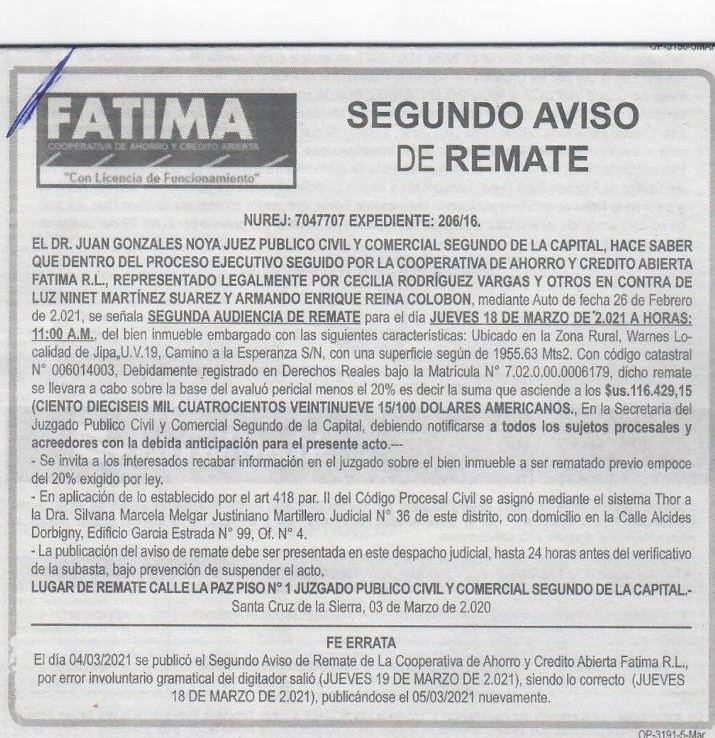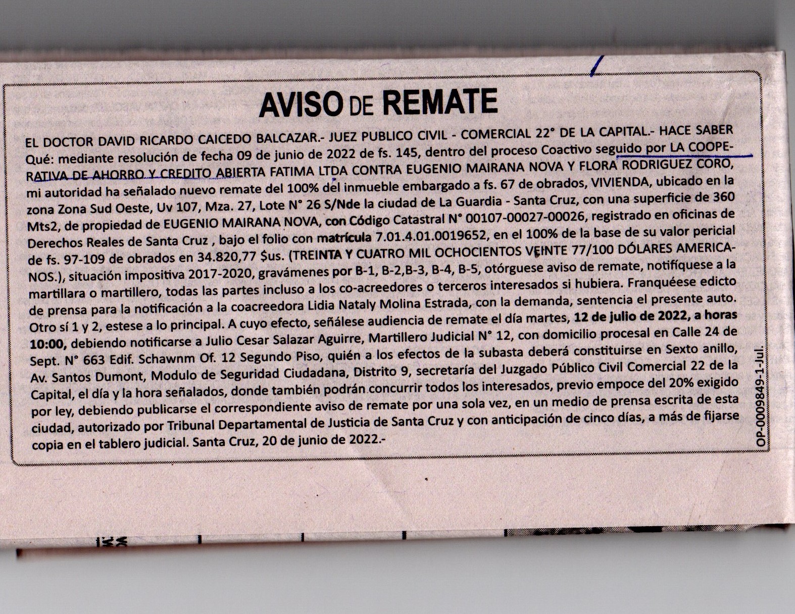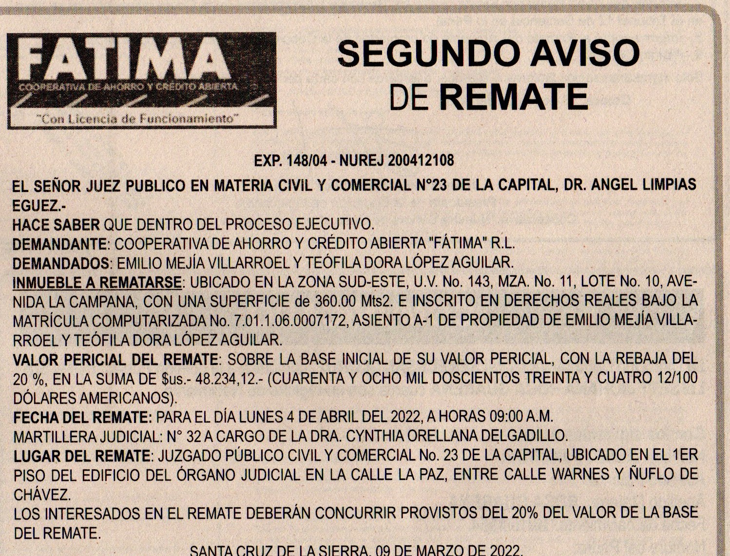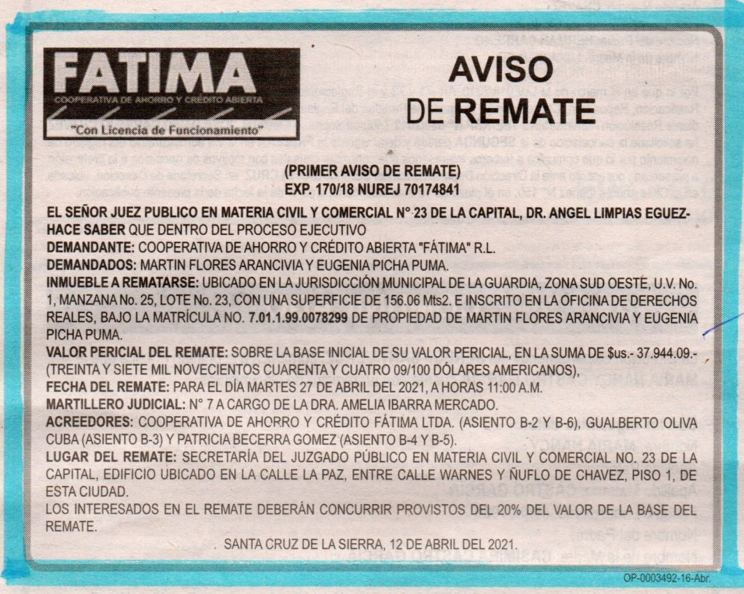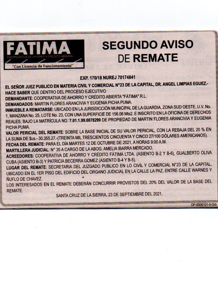 | Santa Cruz | 2DO. AVISO DE REMATE.- Se llevará a cabo el día jueves 17 de junio del 2021 a hrs.09:30 a.m., inmueble de propiedad del Sr. Martin Flores Arancivia y Eugenia Picha Puma, se realizará en la secretaria del Juzgado Público Civil y Comercial Nº23 de la Capita | 6/17/2021, 8:40:42 PM | Ver |