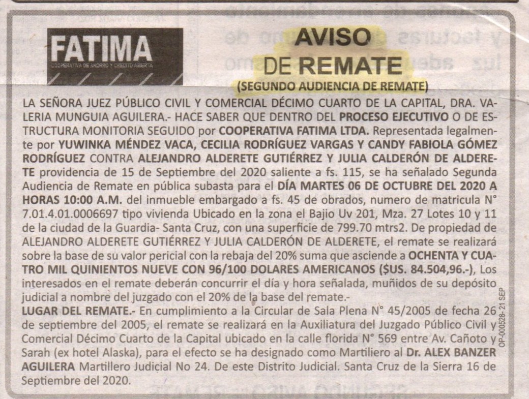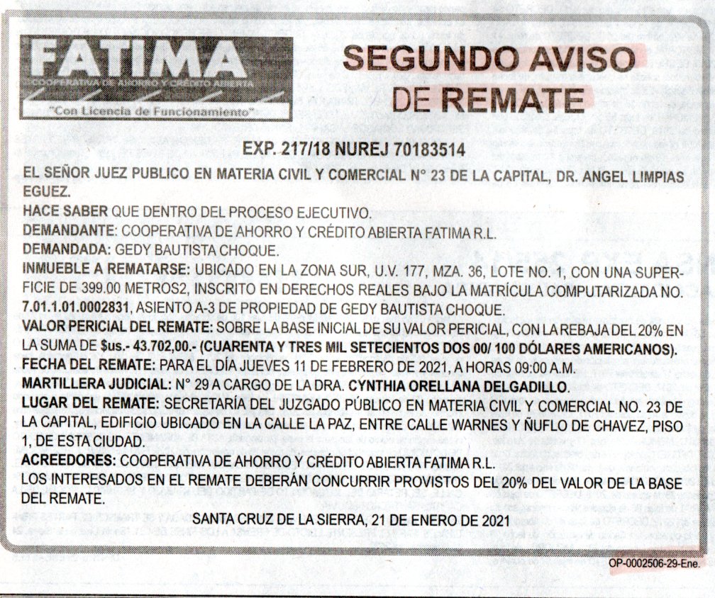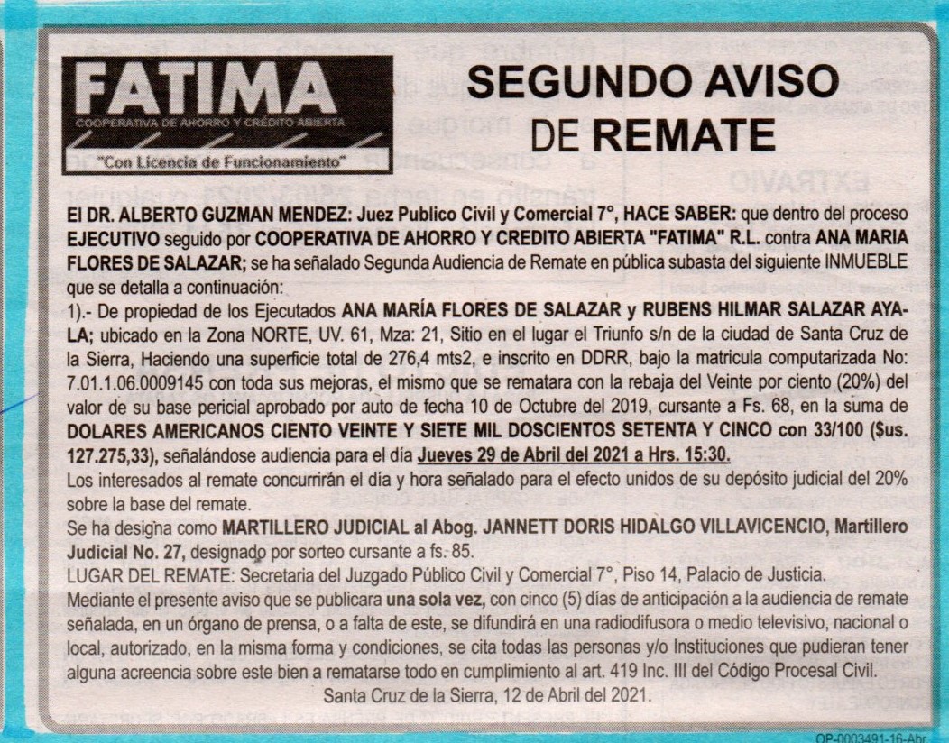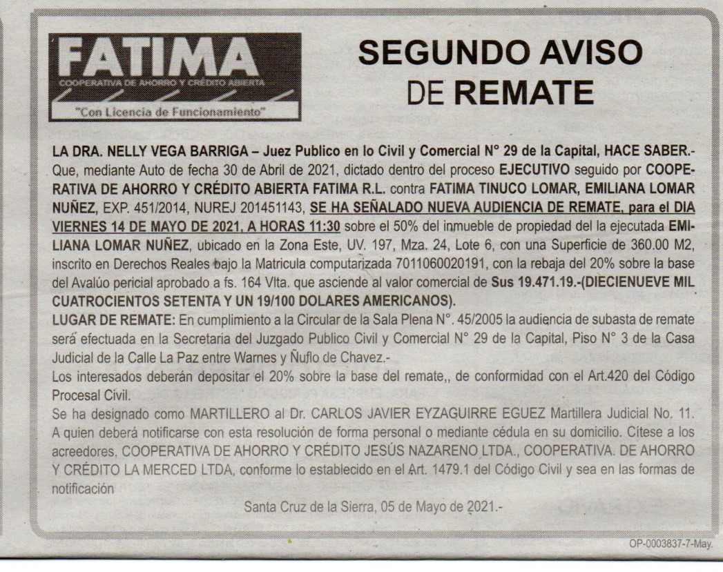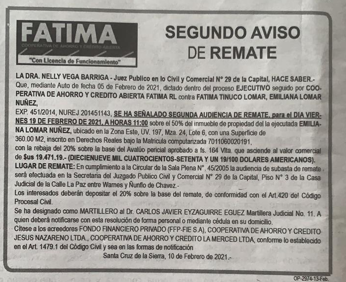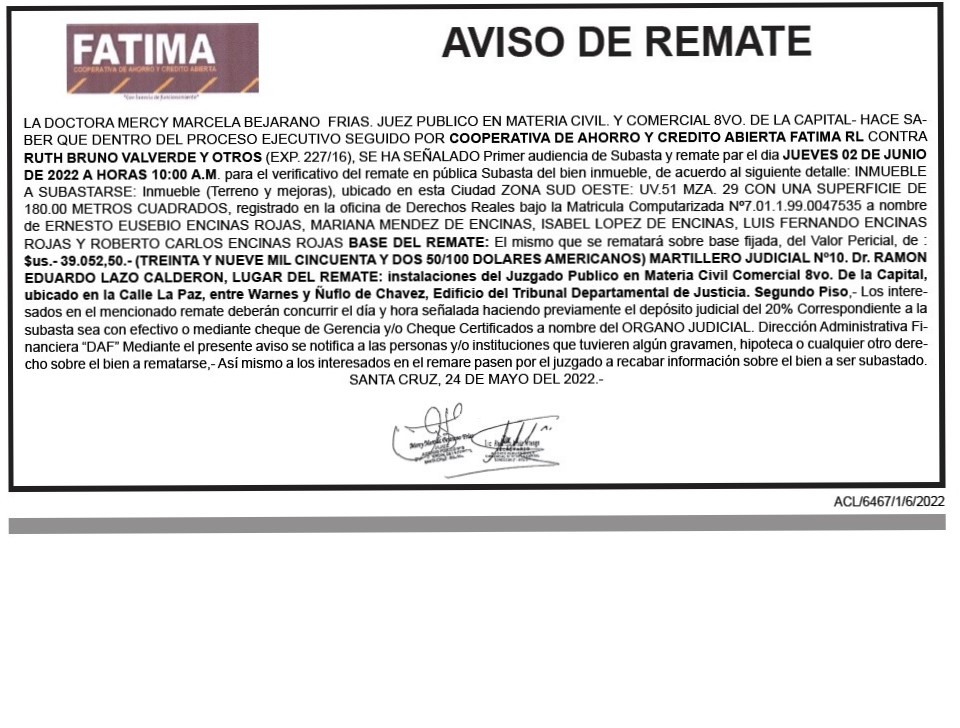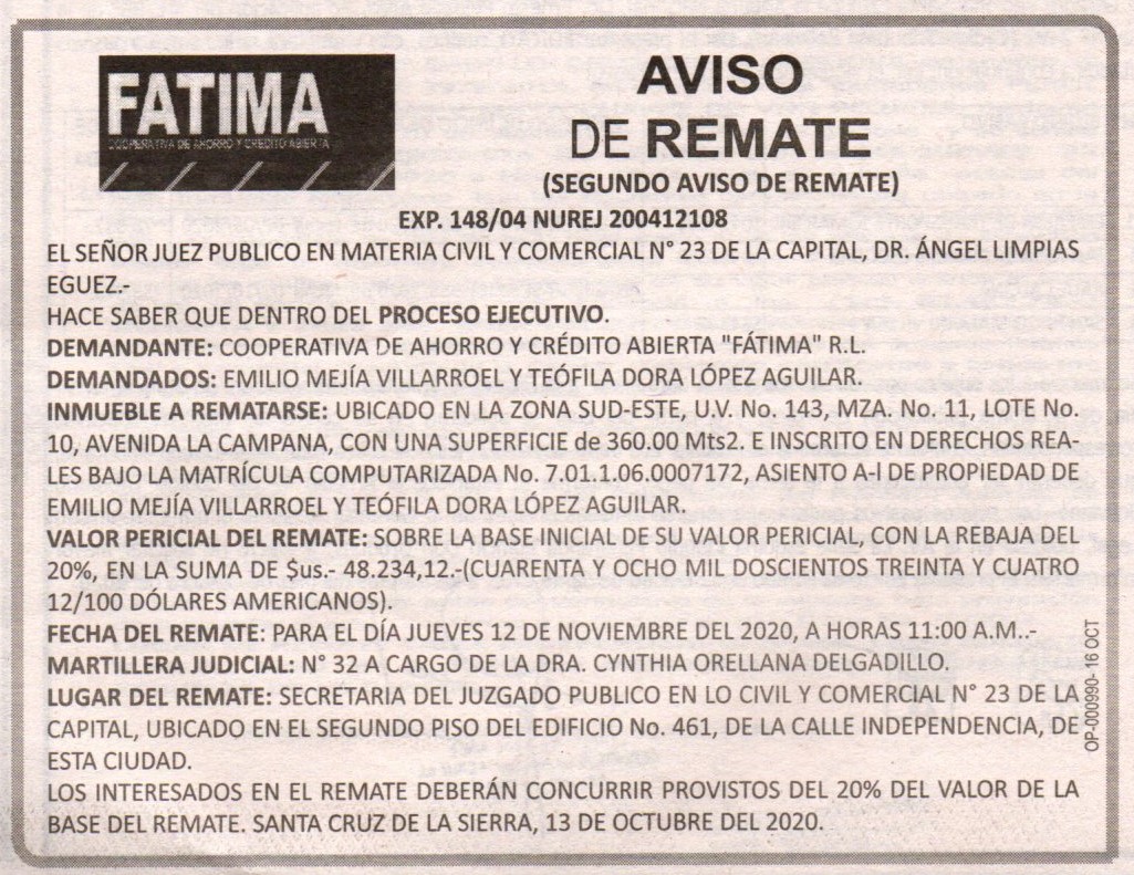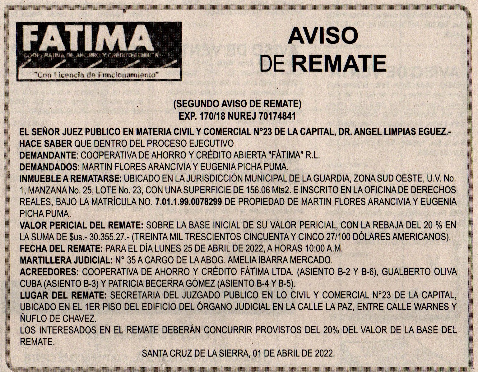 | Santa Cruz | 2DO. AVISO DE REMATE.- Se llevará a cabo el día jueves 17 de junio del 2021 a hrs.09:30 a.m., inmueble de propiedad del Sr. Martin Flores Arancivia y Eugenia Picha Puma, se realizará en la secretaria del Juzgado Público Civil y Comercial Nº23 de la Capita | 6/17/2021, 8:40:42 PM | Ver |
