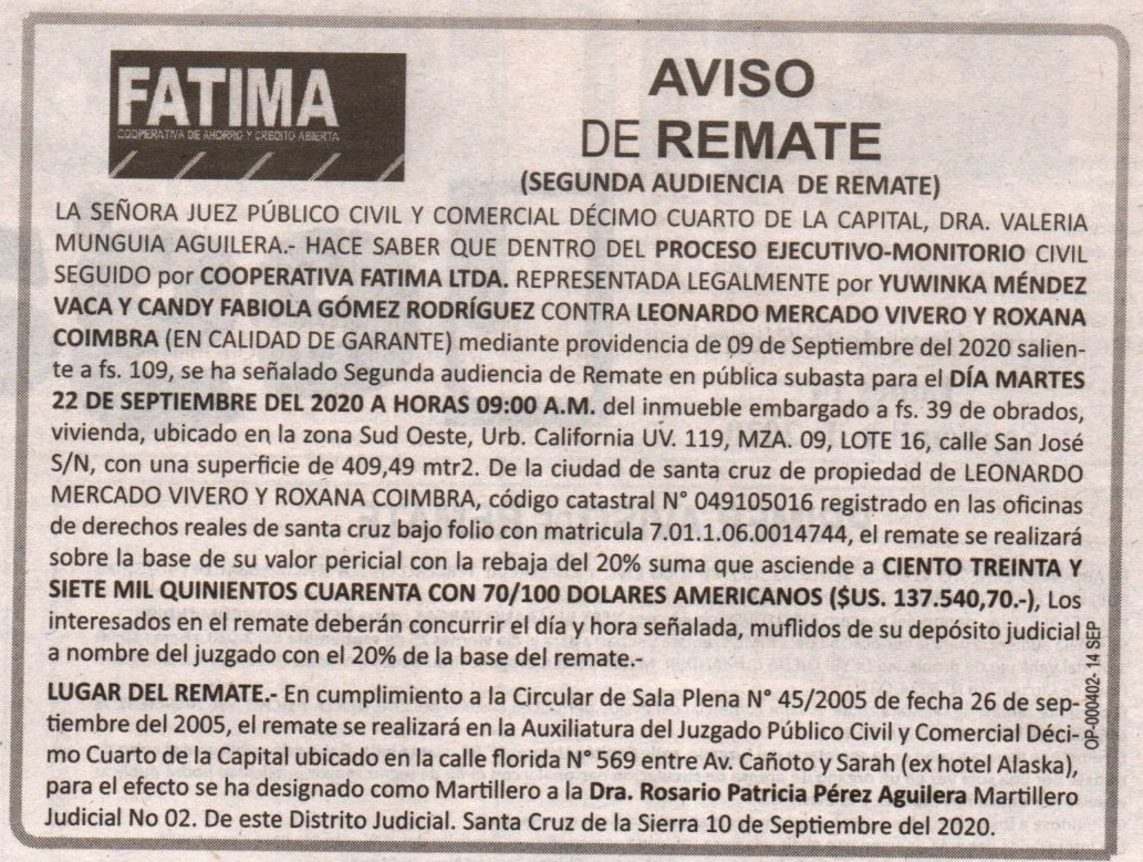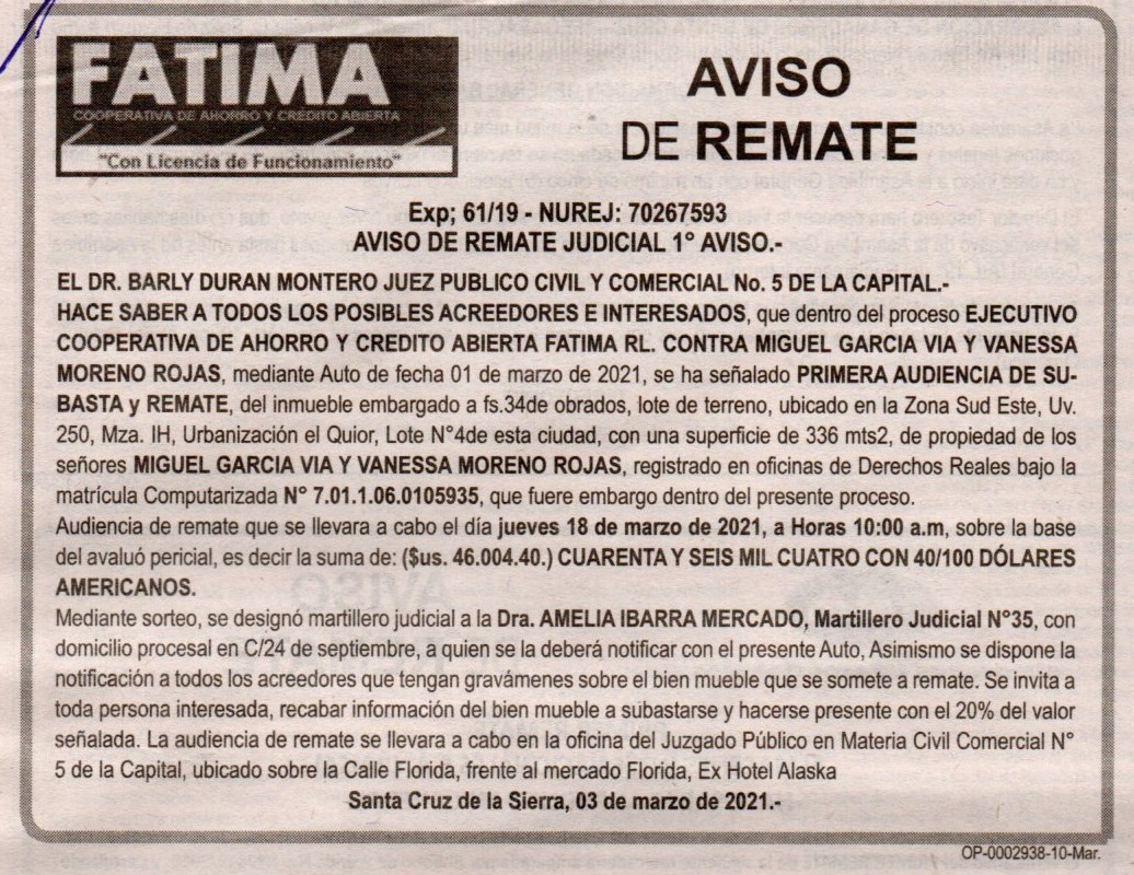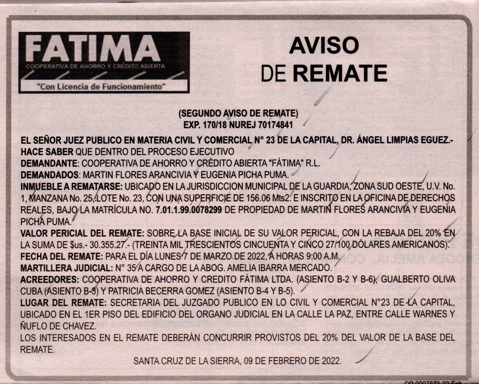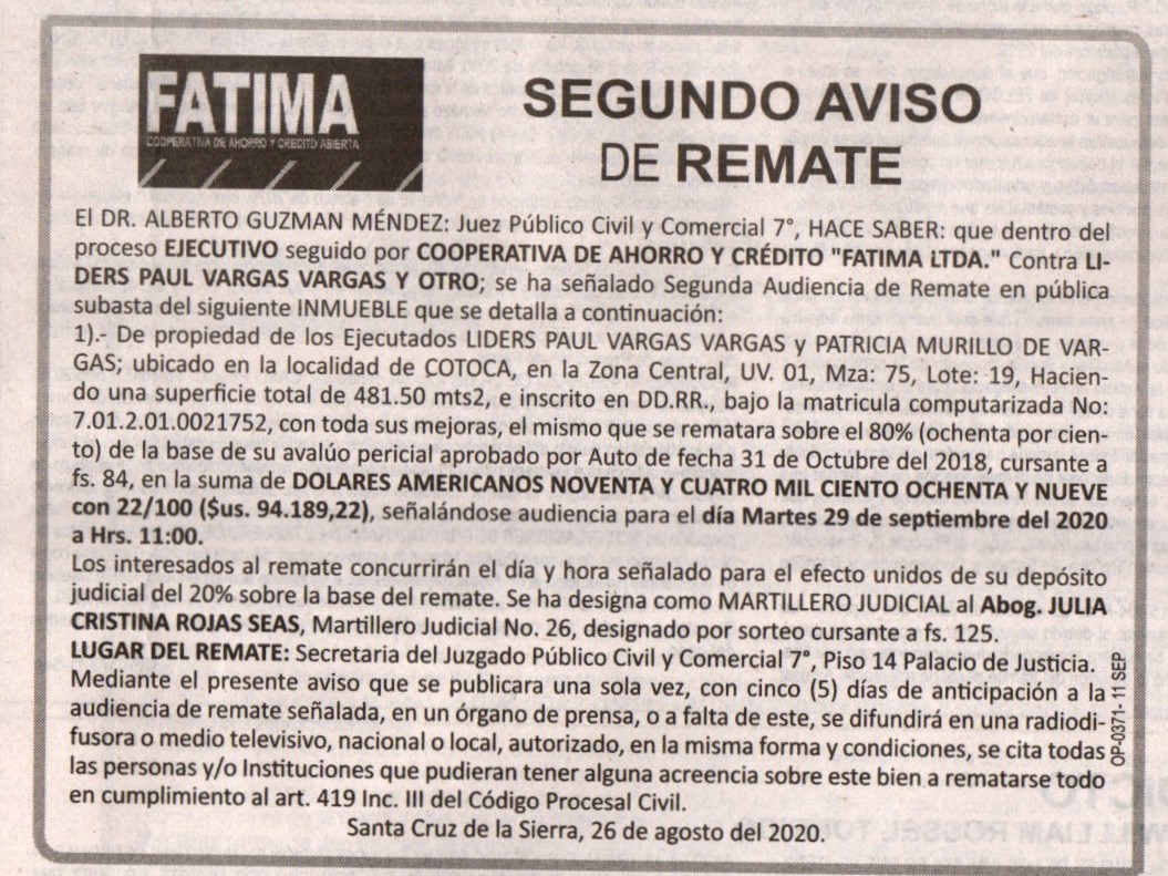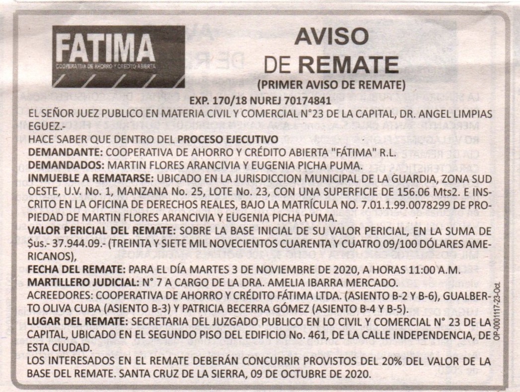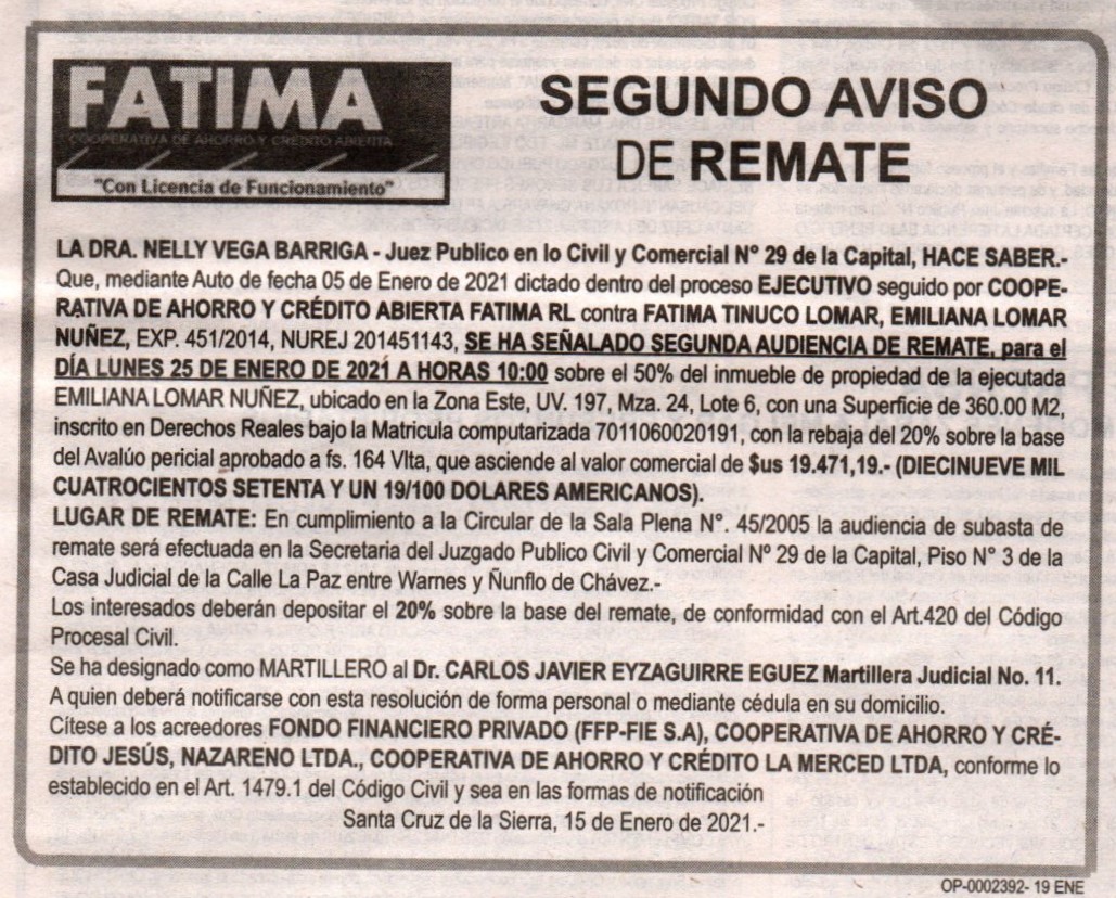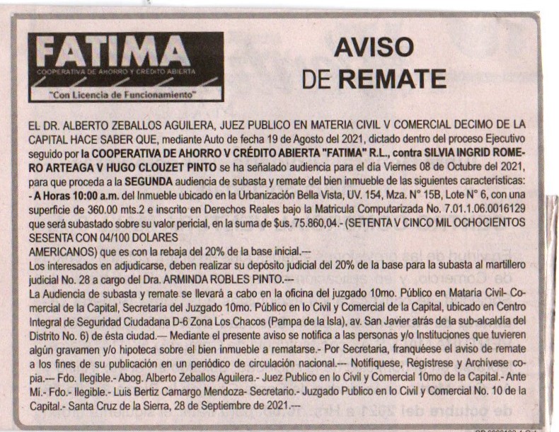| Santa Cruz | 2DO. AVISO DE REMATE.- Se llevará a cabo el día jueves 17 de junio del 2021 a hrs.09:30 a.m., inmueble de propiedad del Sr. Martin Flores Arancivia y Eugenia Picha Puma, se realizará en la secretaria del Juzgado Público Civil y Comercial Nº23 de la Capita | 6/17/2021, 8:40:42 PM | Ver |