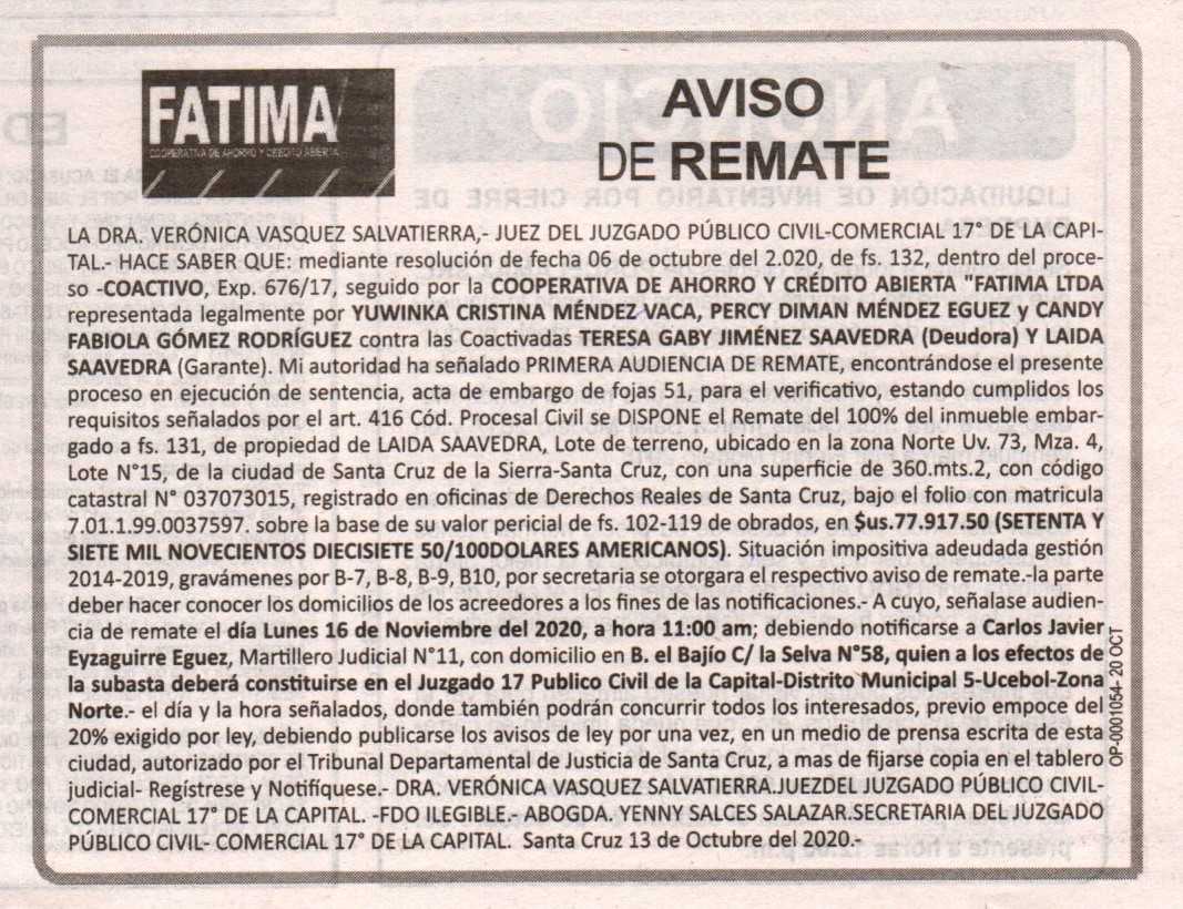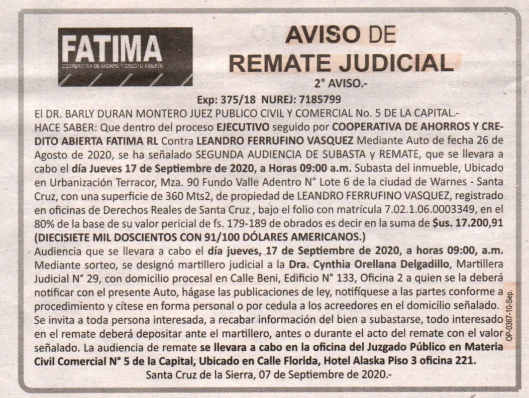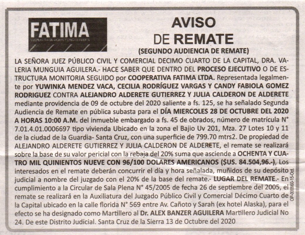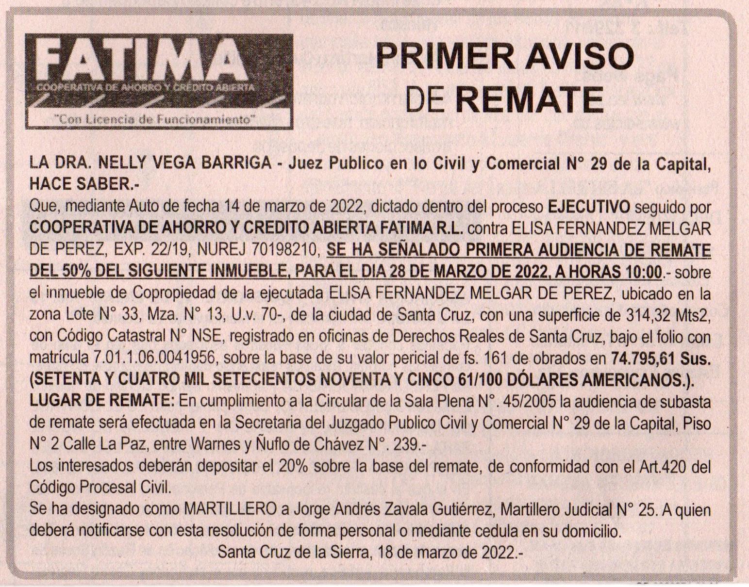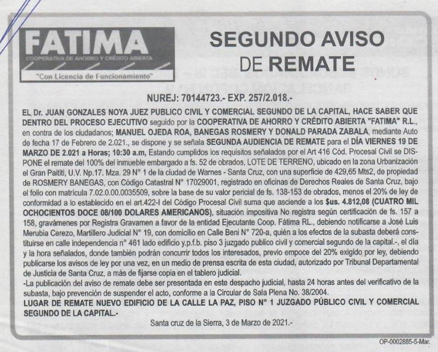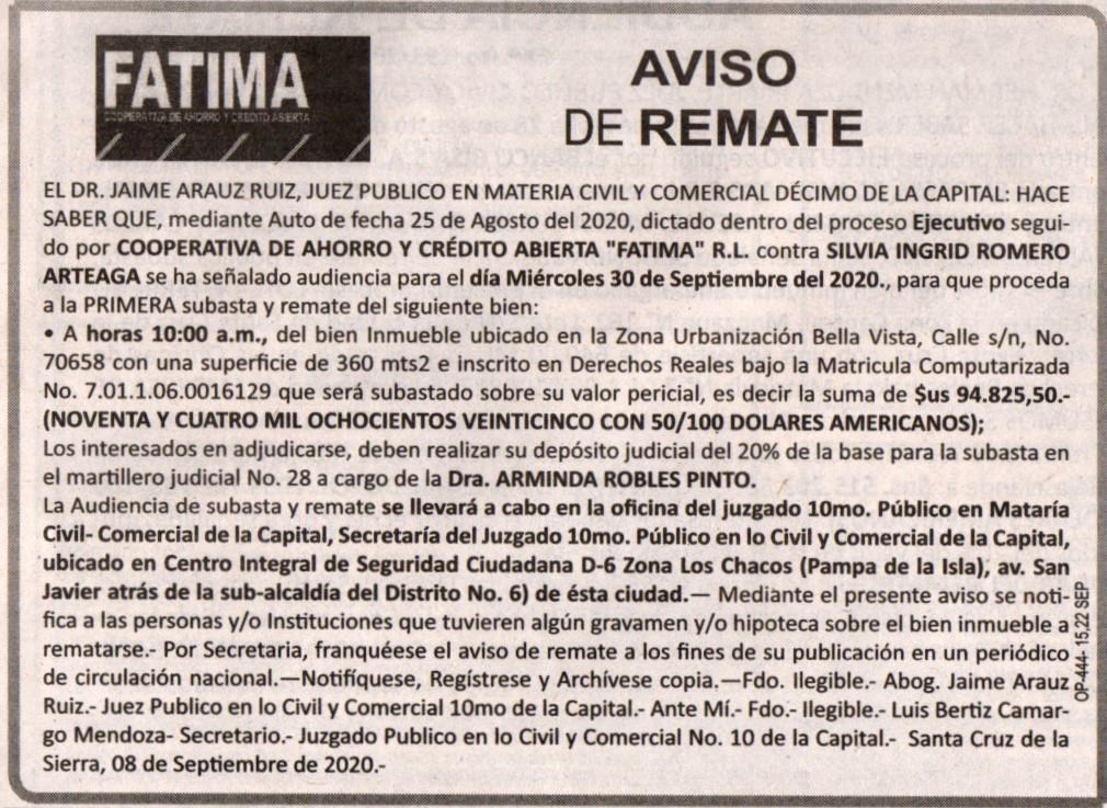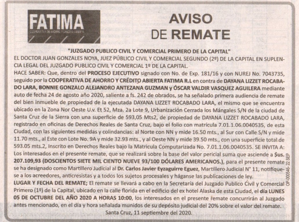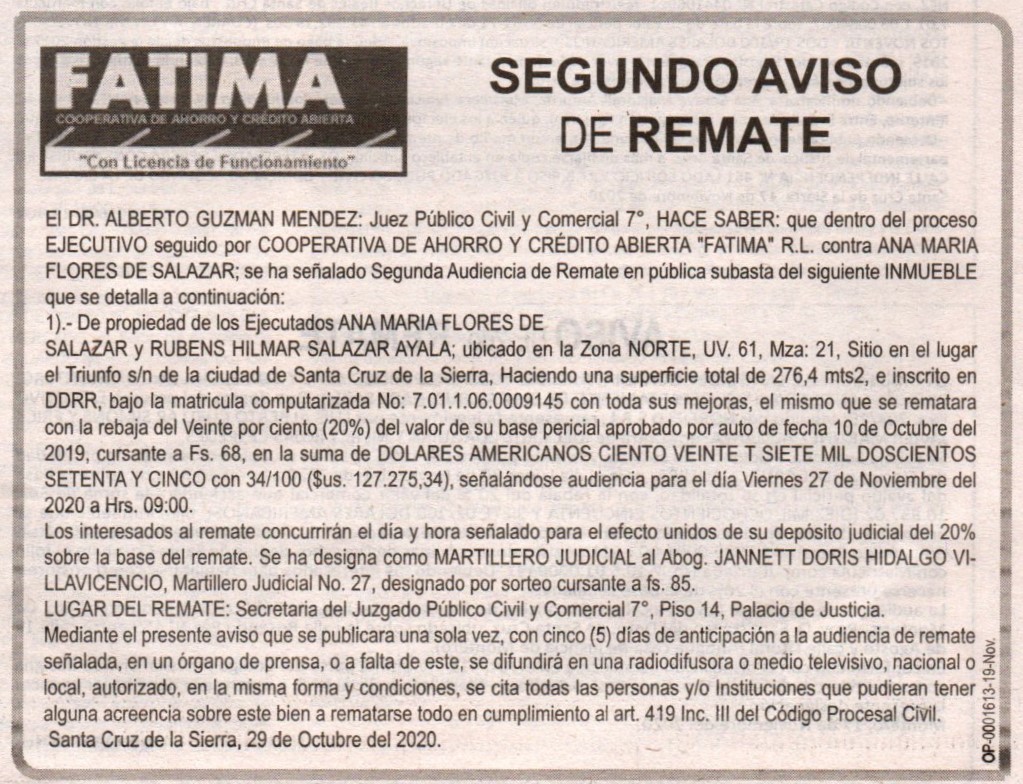 | Santa Cruz | 2DO. AVISO DE REMATE.- Se llevará a cabo el día jueves 17 de junio del 2021 a hrs.09:30 a.m., inmueble de propiedad del Sr. Martin Flores Arancivia y Eugenia Picha Puma, se realizará en la secretaria del Juzgado Público Civil y Comercial Nº23 de la Capita | 6/17/2021, 8:40:42 PM | Ver |