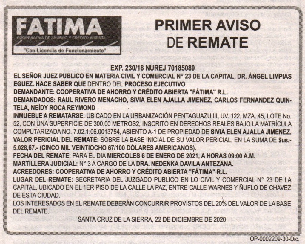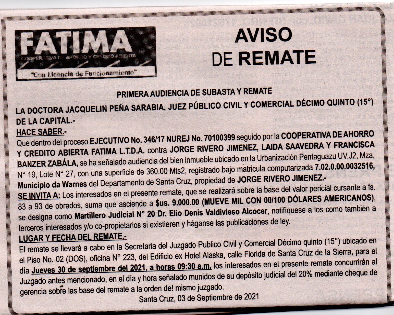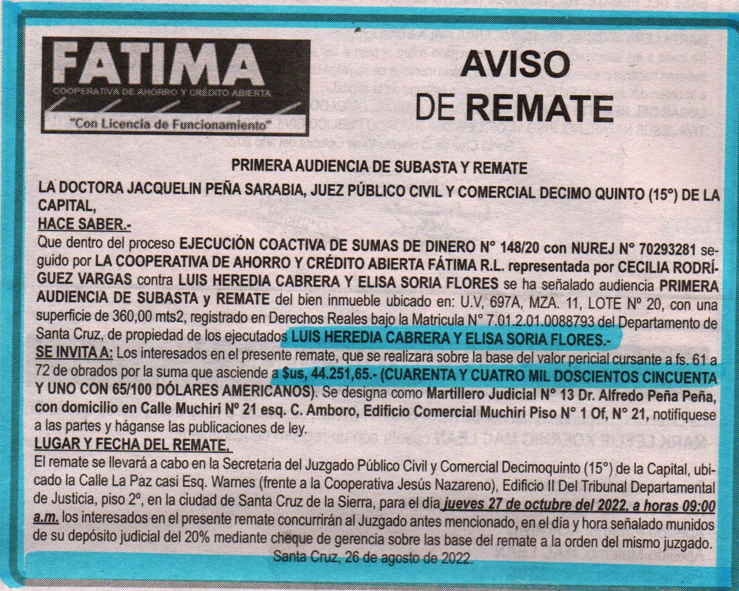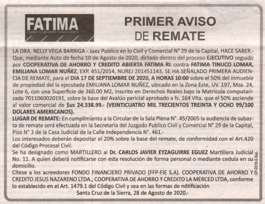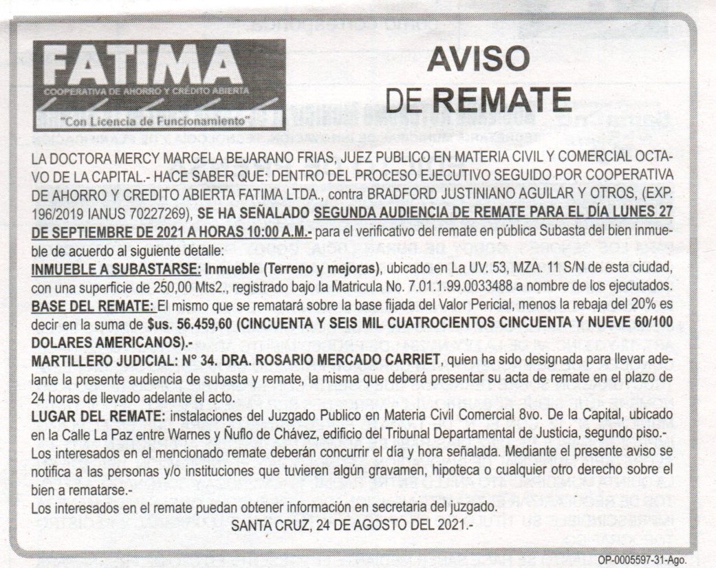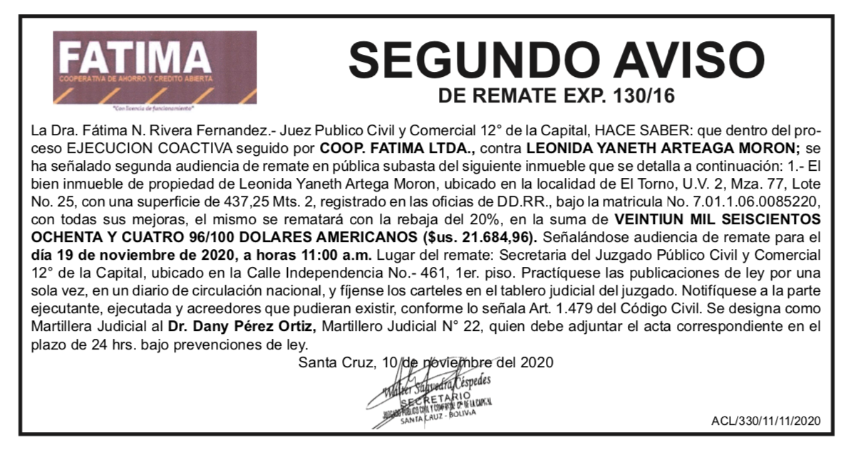 | Santa Cruz | 2DO. AVISO DE REMATE.- Se llevará a cabo el día jueves 17 de junio del 2021 a hrs.09:30 a.m., inmueble de propiedad del Sr. Martin Flores Arancivia y Eugenia Picha Puma, se realizará en la secretaria del Juzgado Público Civil y Comercial Nº23 de la Capita | 6/17/2021, 8:40:42 PM | Ver |