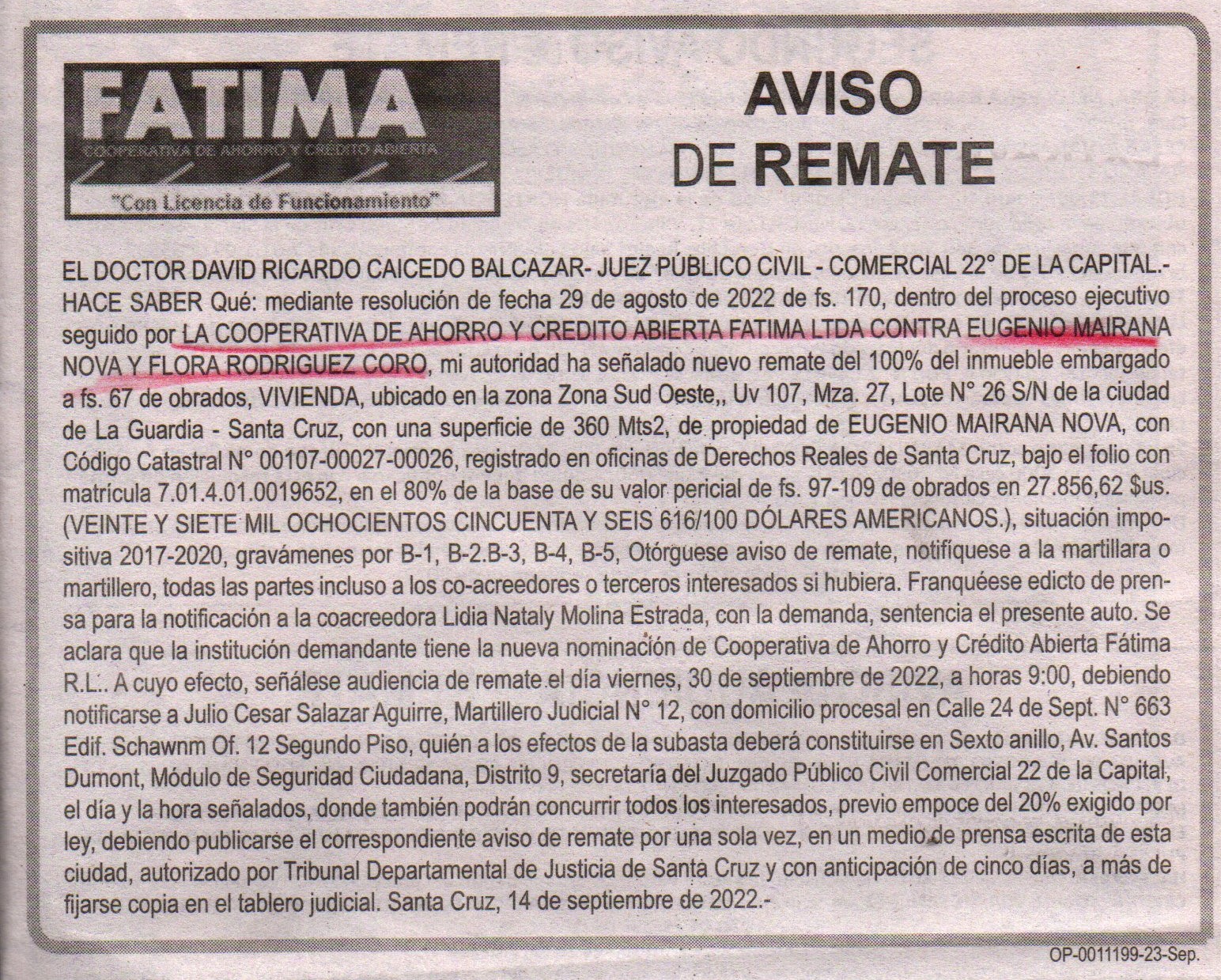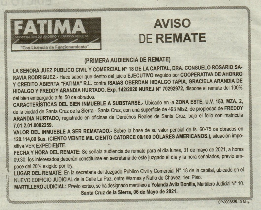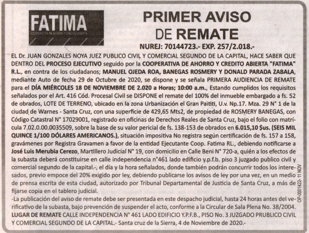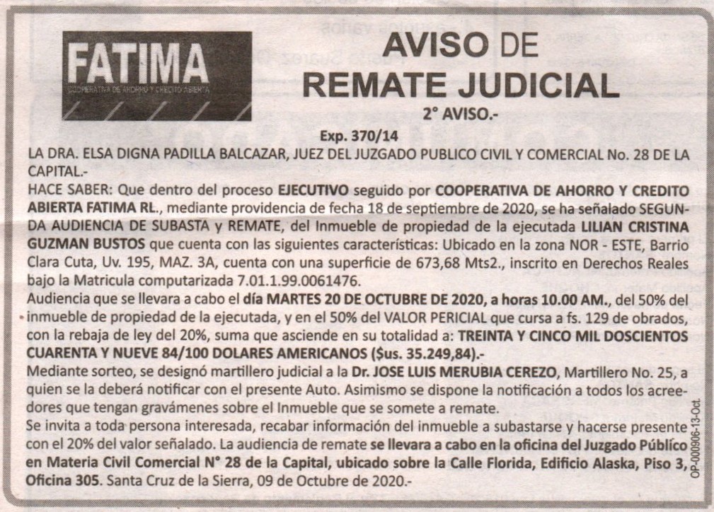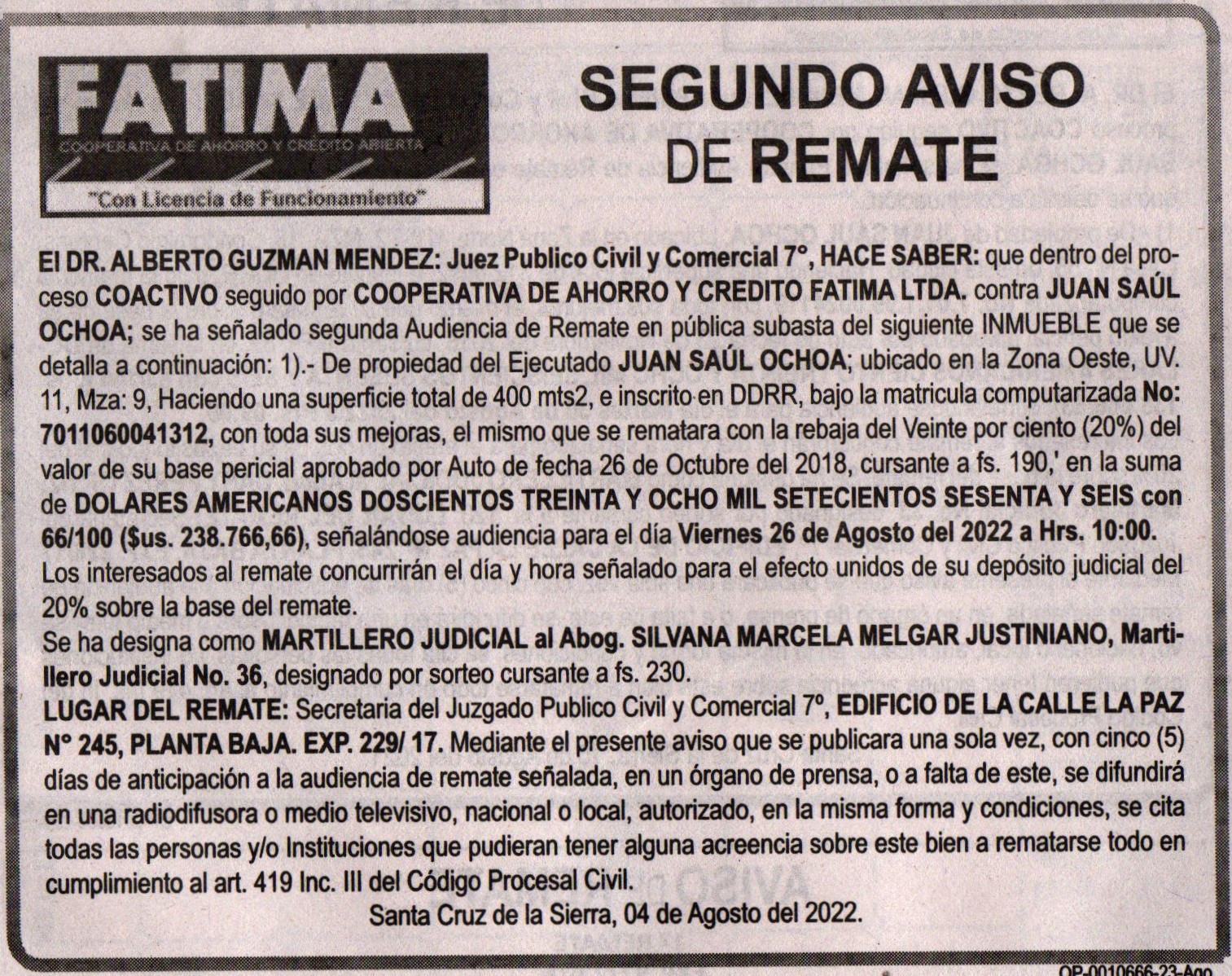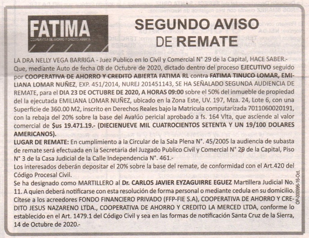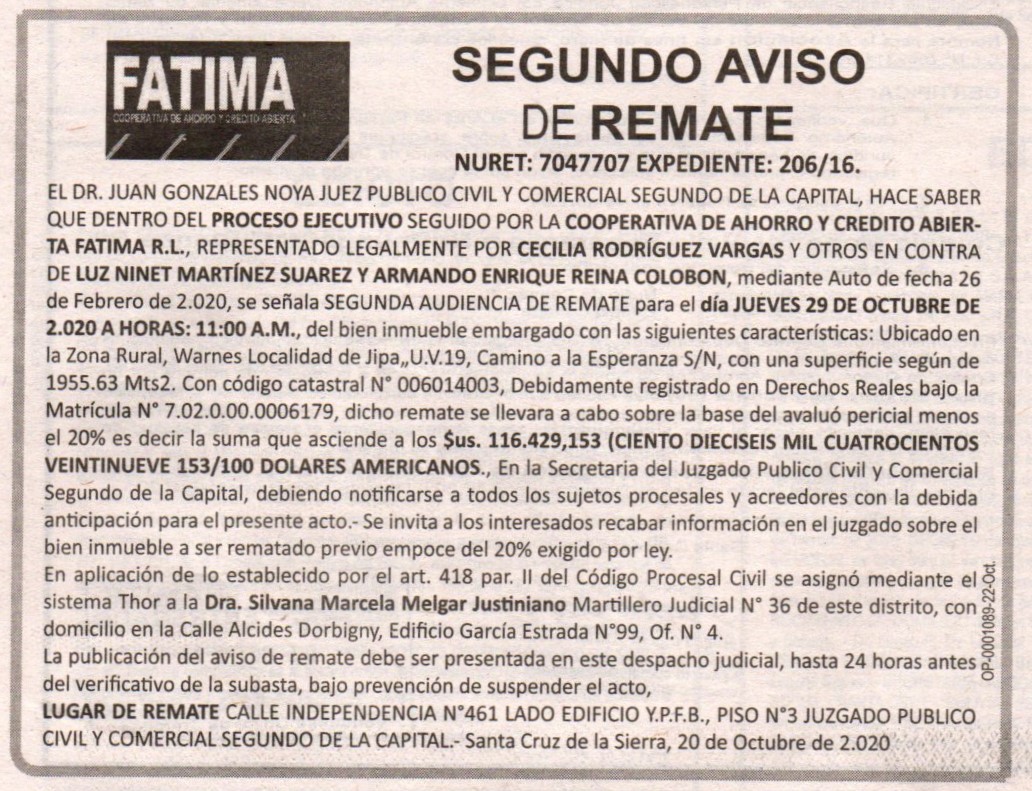 | Santa Cruz | 2DO. AVISO DE REMATE.- Se llevará a cabo el día jueves 17 de junio del 2021 a hrs.09:30 a.m., inmueble de propiedad del Sr. Martin Flores Arancivia y Eugenia Picha Puma, se realizará en la secretaria del Juzgado Público Civil y Comercial Nº23 de la Capita | 6/17/2021, 8:40:42 PM | Ver |
