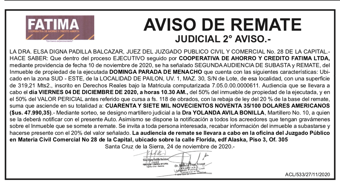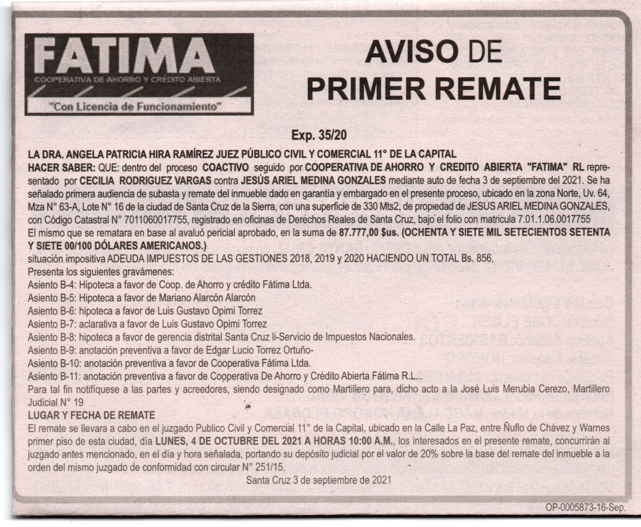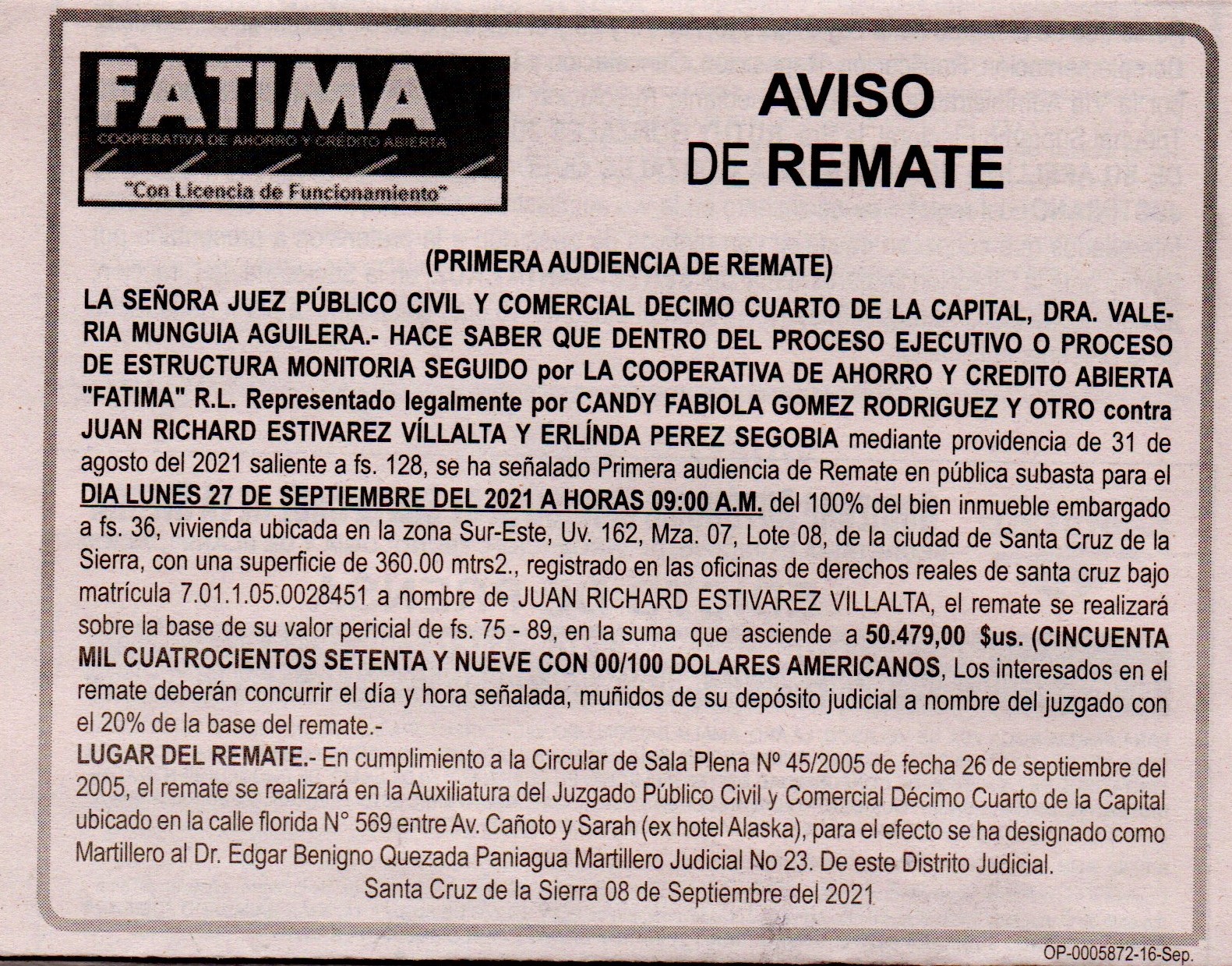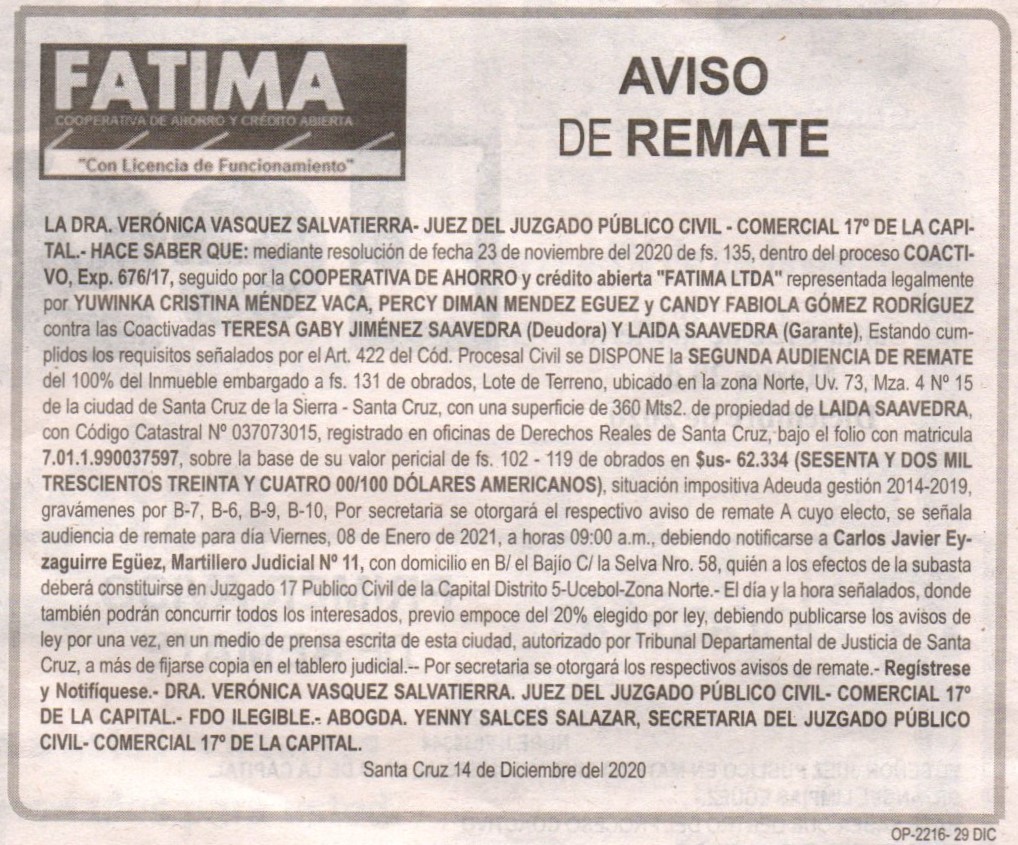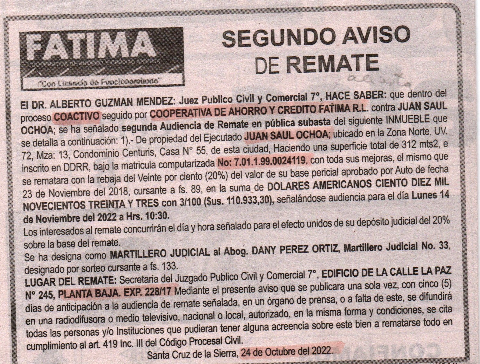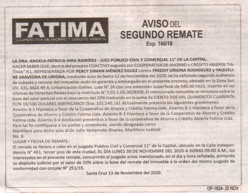 | Santa Cruz | 2DO. AVISO DE REMATE.- Se llevará a cabo el día jueves 17 de junio del 2021 a hrs.09:30 a.m., inmueble de propiedad del Sr. Martin Flores Arancivia y Eugenia Picha Puma, se realizará en la secretaria del Juzgado Público Civil y Comercial Nº23 de la Capita | 6/17/2021, 8:40:42 PM | Ver |