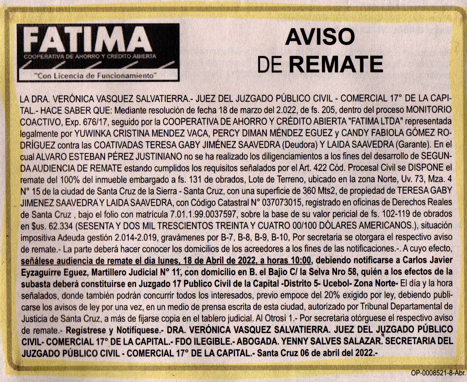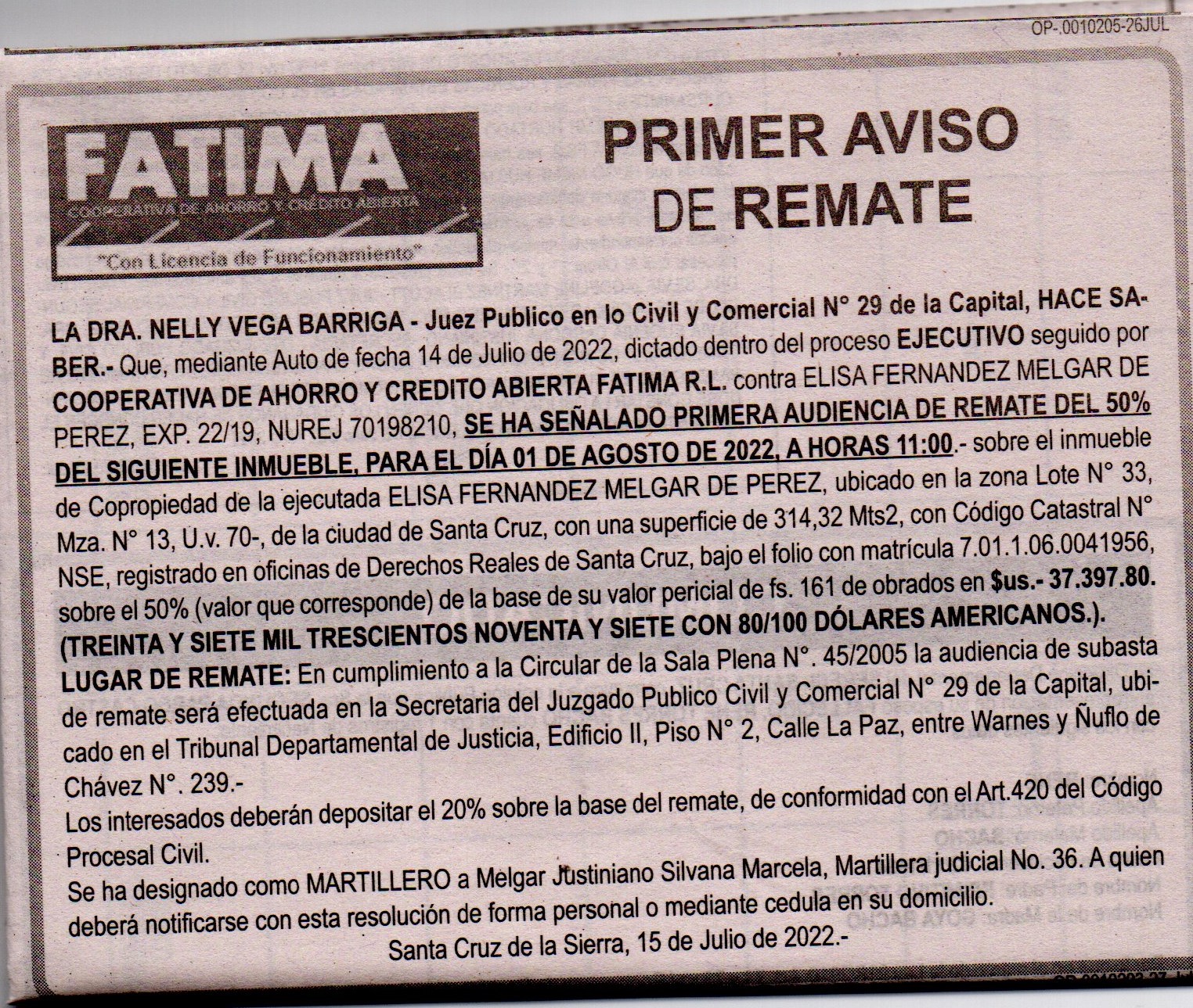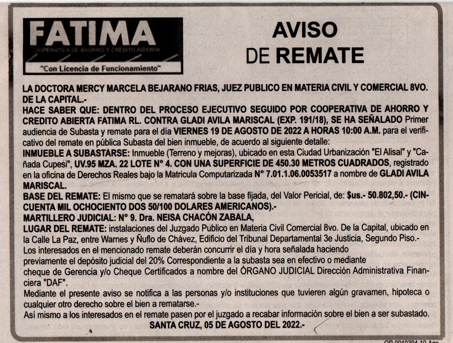 | Santa Cruz | 2DA.AUD.REMATE TERESA GABY JIMENEZ SAAVEDRA | 4/18/2022, 9:17:05 PM | Ver |