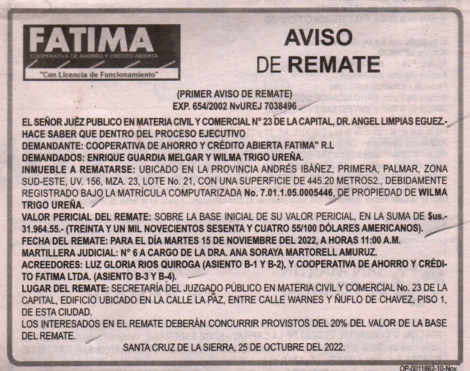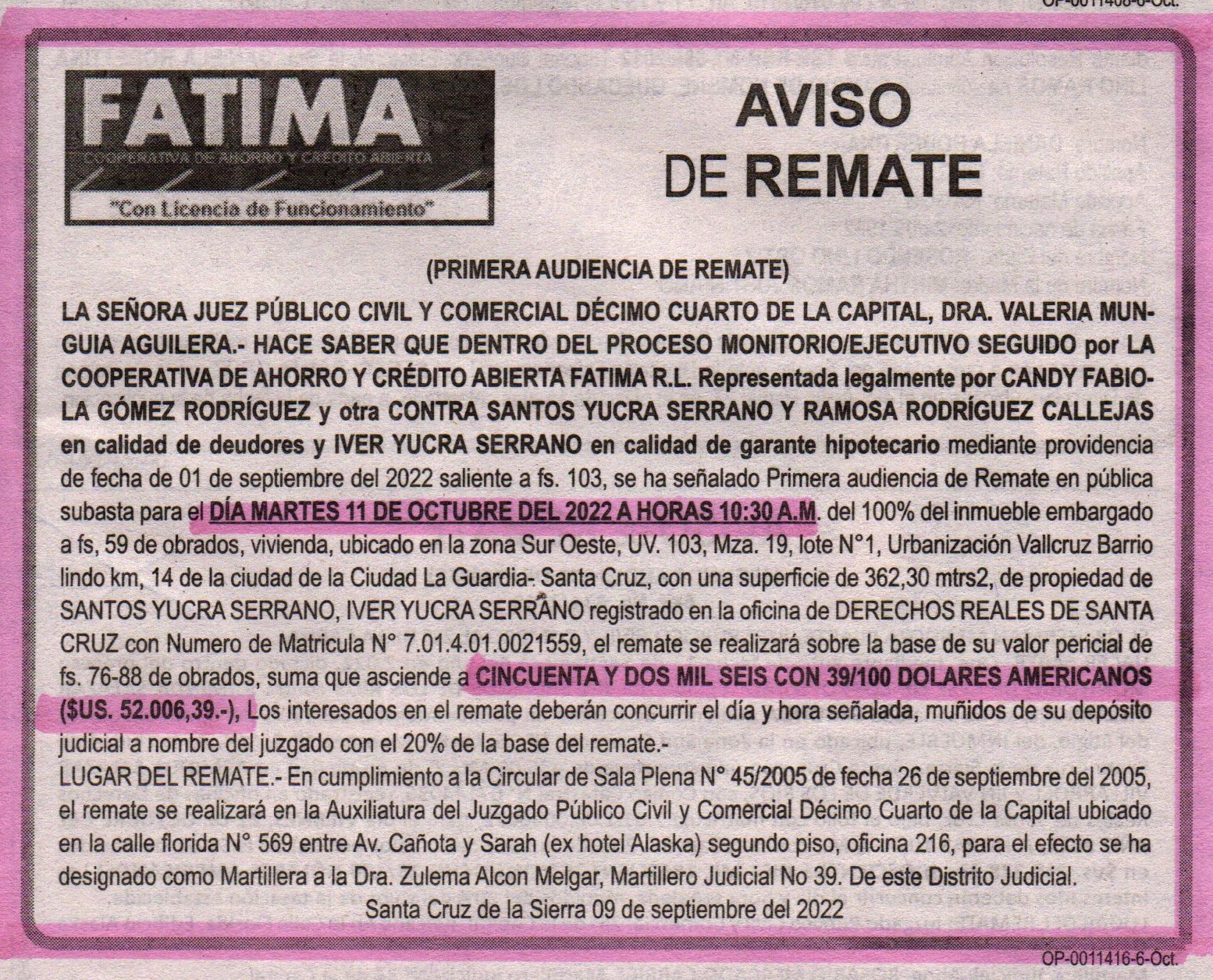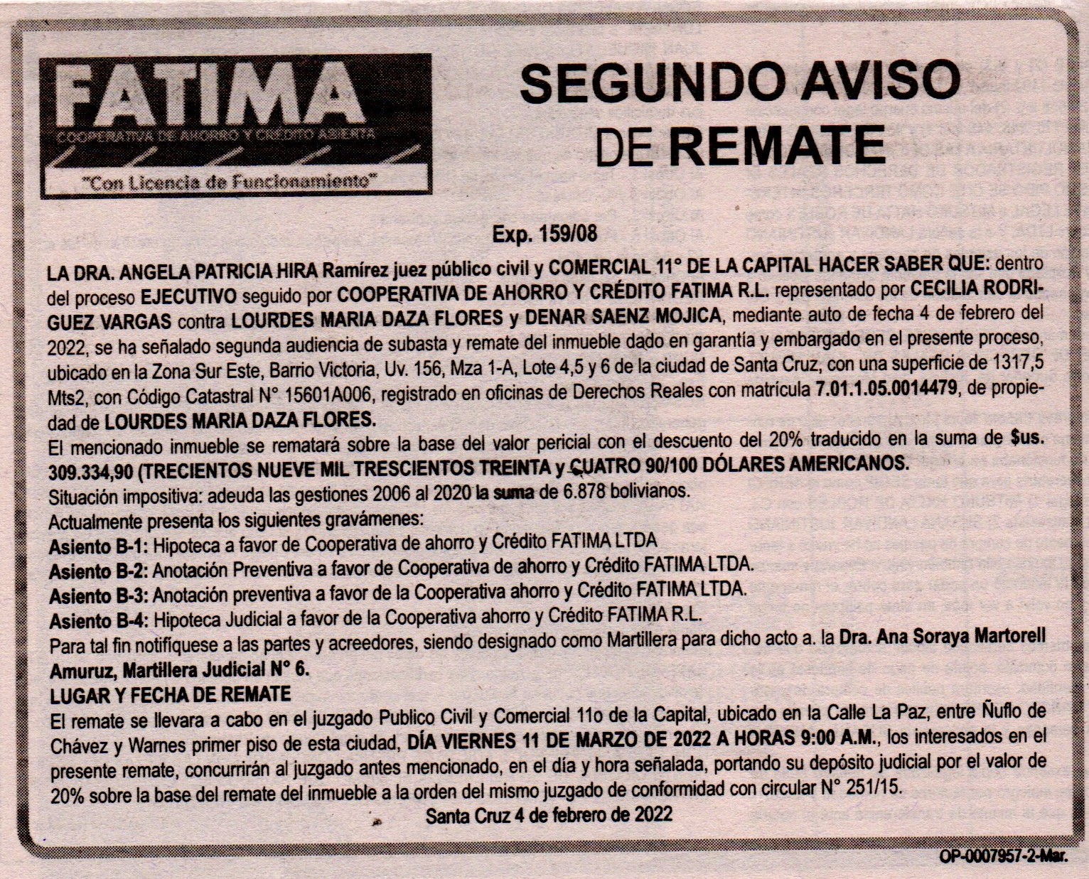 | Santa Cruz | 2DA.AUD.REMATE TERESA GABY JIMENEZ SAAVEDRA | 4/18/2022, 9:17:05 PM | Ver |